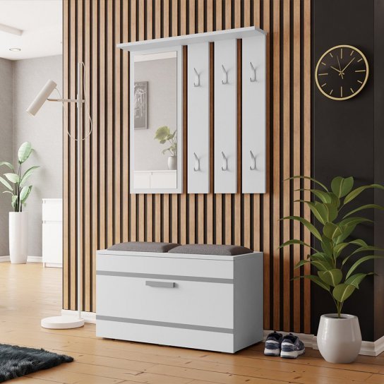 A előszoba bútor készlet méretre szabott helyisége segít jól megszervezni a teret, lehetővé teszi a gyors cipőcserét, kabátot, valamint sapkát vagy kesztyűt.