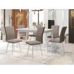 A kárpitozott székek tökéletesen illeszkednek az asztal stílusához. Kényelmes ülést és háttámlát kínálnak, ami növeli a bútorok használatának kényelmét. Az asztalhosszabbító betét diszkréten illeszkedik az asztallap alatt található dobozba.