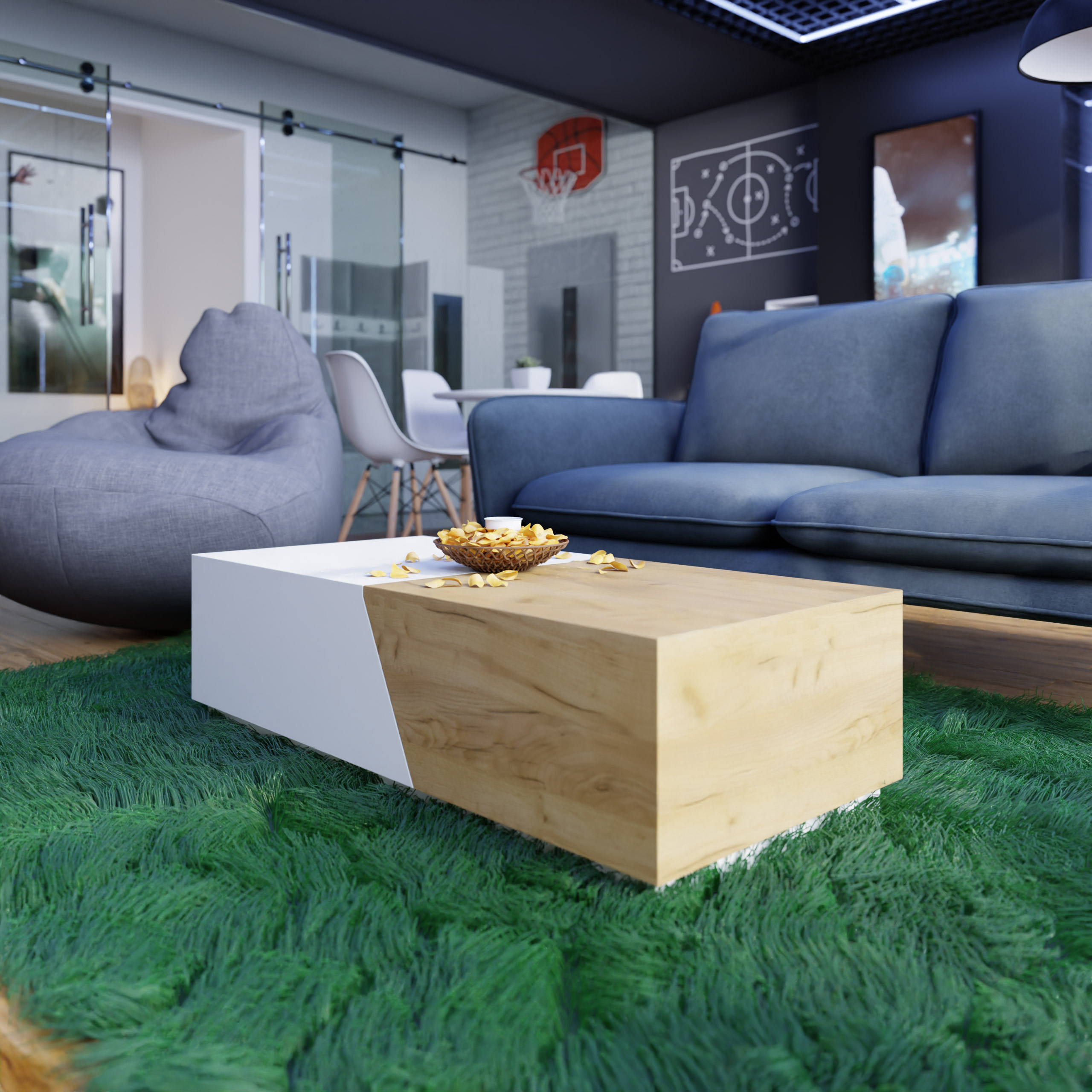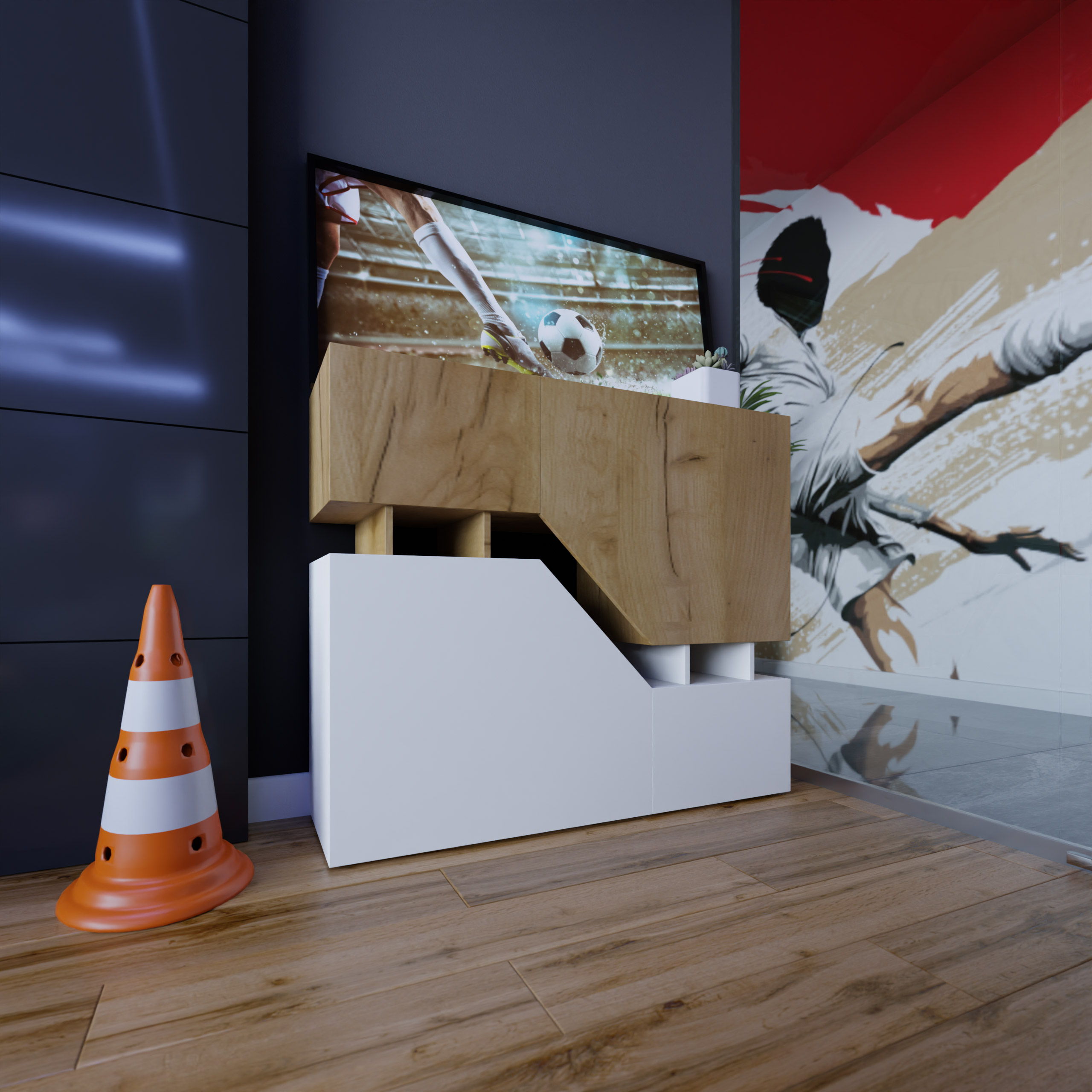 Egy ilyen térben kell lennie ülőhelynek. Szeretnénk hangsúlyozni a rendkívül funkcionális, helyről-helyre mozgatható táskák szerepét. Egy másik fontos elem a dohányzóasztalok, ahol harapnivalókat és kedvenc italokat helyezhet el. A futball-stílusú belső tér nem nélkülözhető TV nélkül, így az RTV szekrény is nélkülözhetetlen. És hova tegye a kedvenc tudományágához kapcsolódó kütyüket? A könyvespolcon és egy tágas komódon lesz számukra hely.