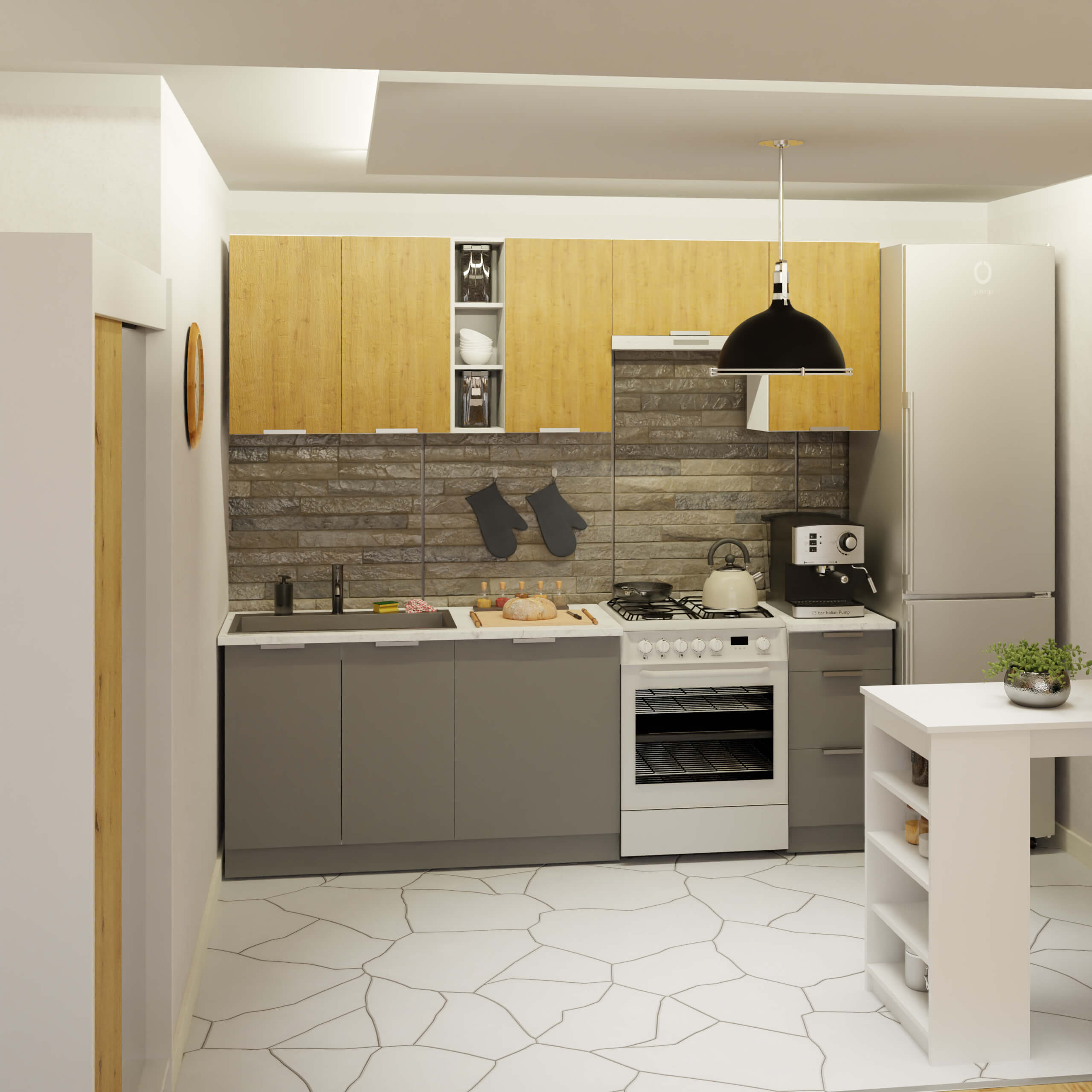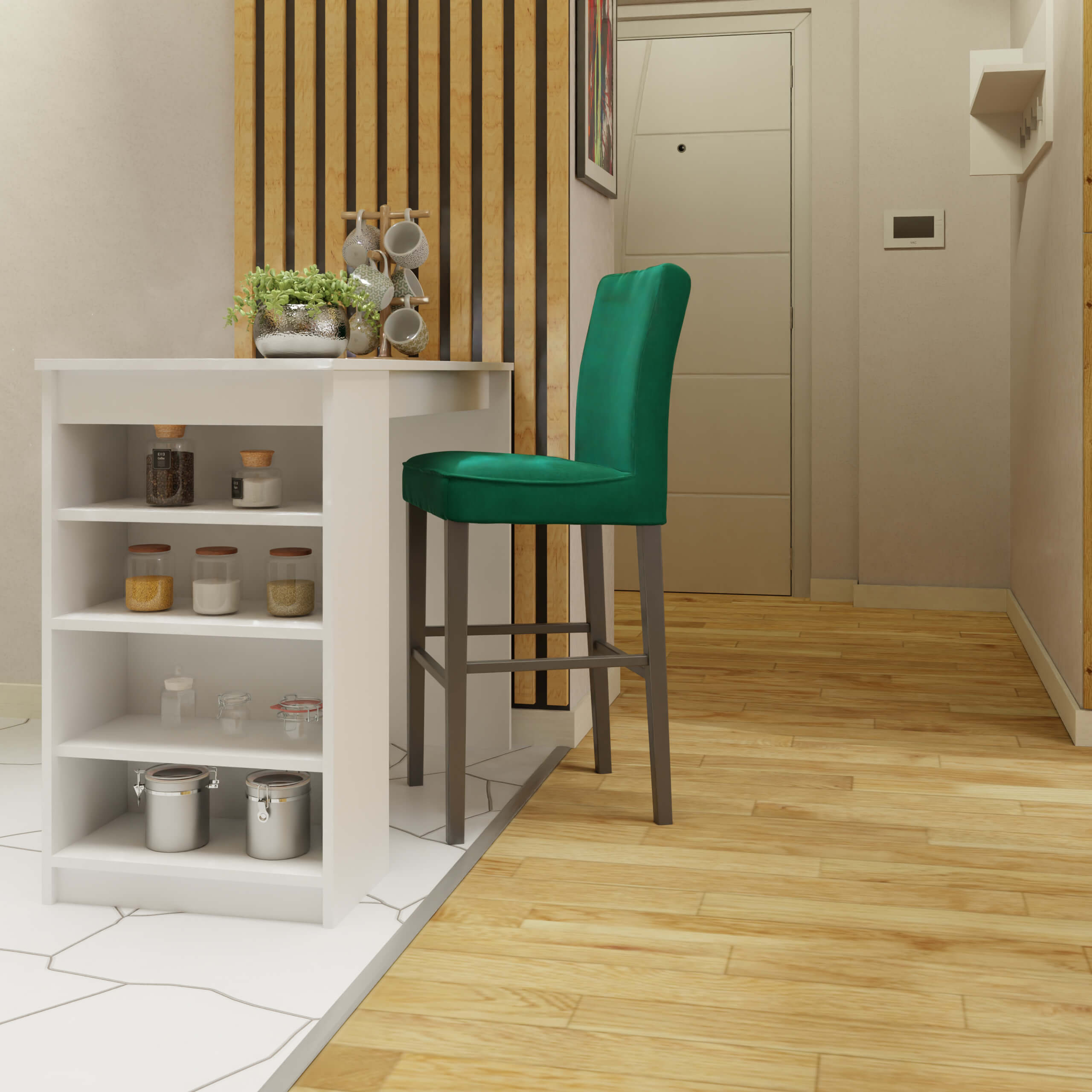 A világos színek használata: szürke, fehér és fa árnyalatok optikailag nagyobbá tette a kis lakást. A kontrasztos kanapéval és bárszékkel kombinálva az egész stílusos és modern megjelenésű.