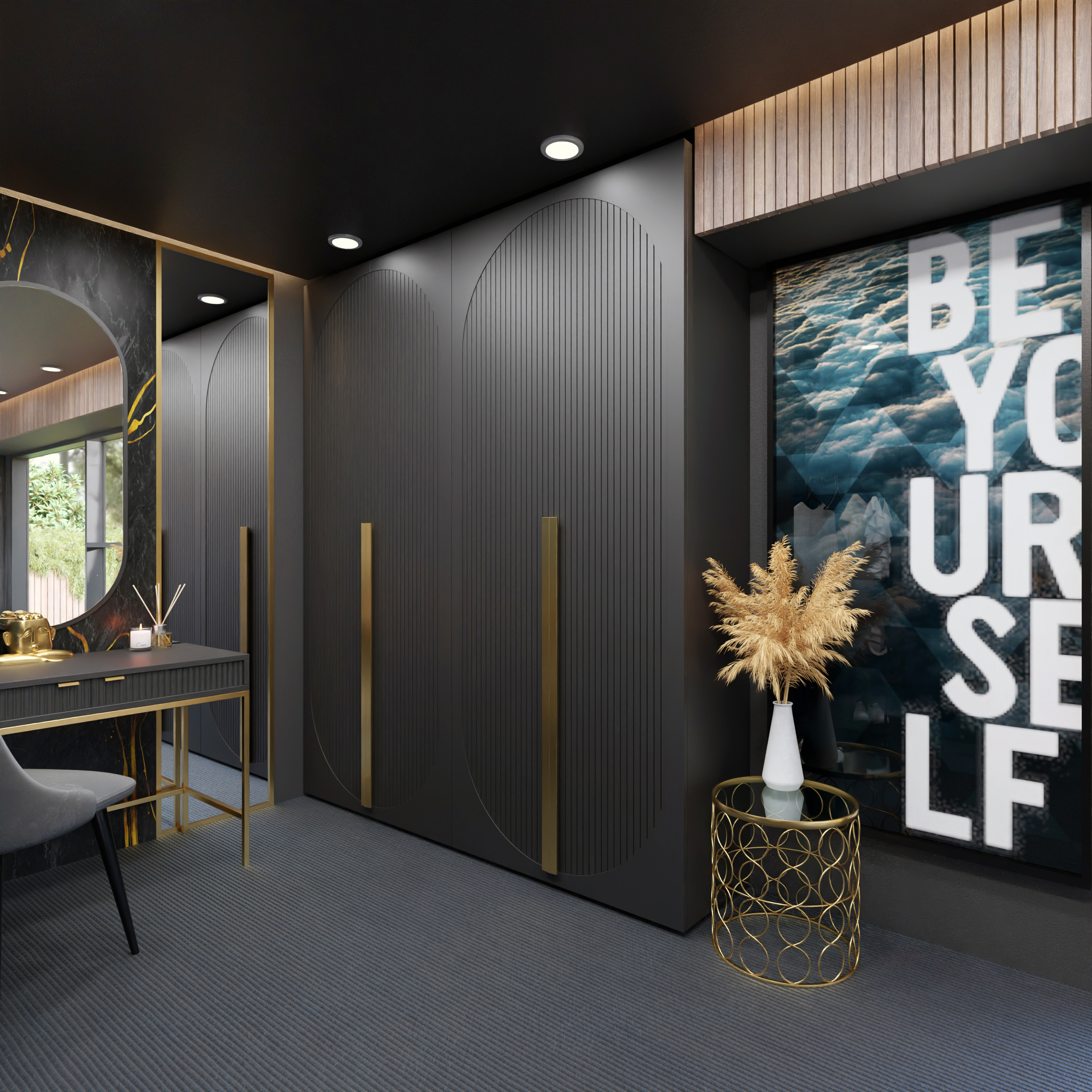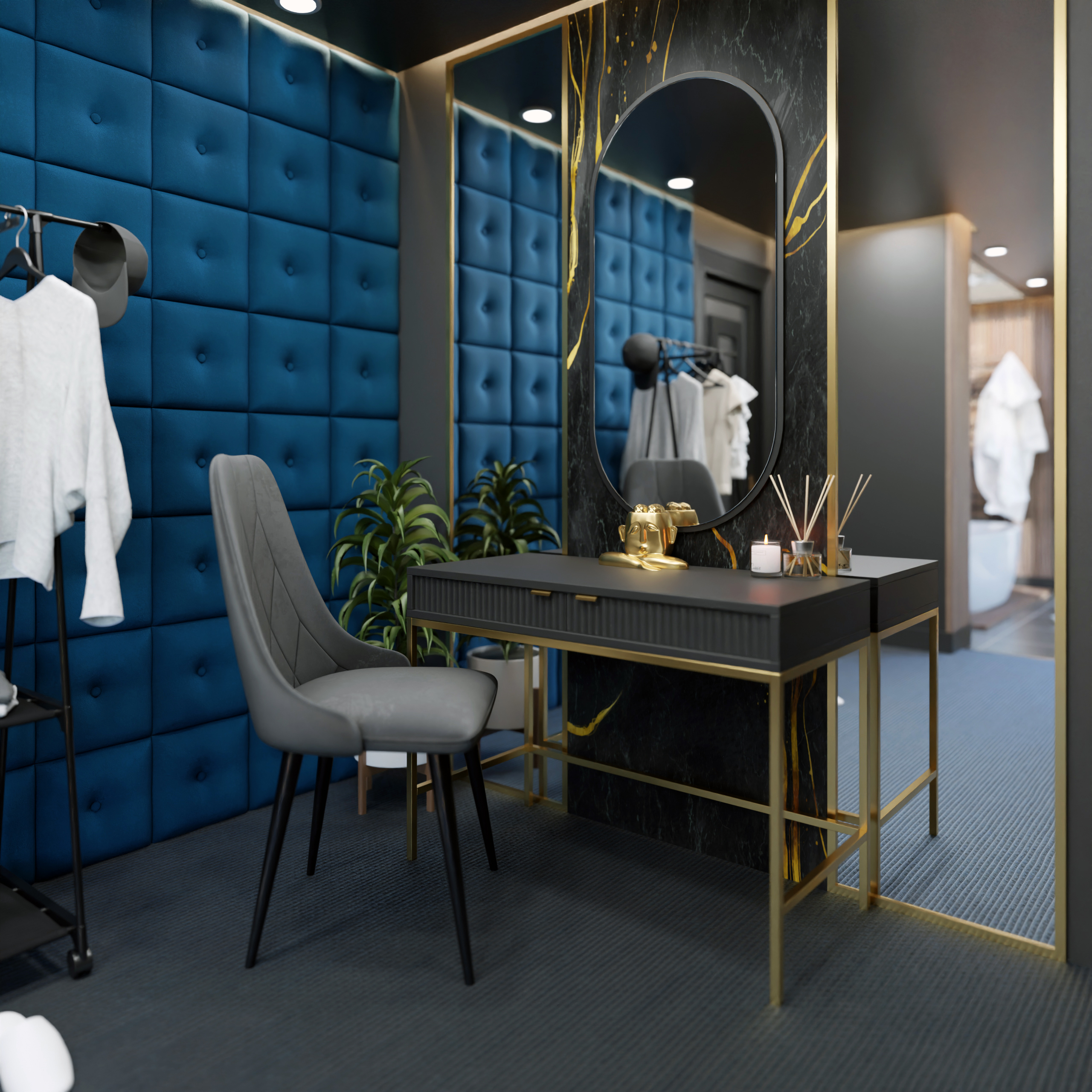 Ihletünk alapján egy funkcionális belső teret szeretnénk kialakítani, amely előszobaként, gardróbként és ápolósarokként is szolgálhat. Középen a Mijan Gold konzol található, amely kiválóan alkalmas kozmetikumok és egyéb kiegészítők tárolására. Praktikus fiókjainak köszönhetően elrejtheti azokat a tárgyakat, amelyeknek nem szabad a szemébe kerülniük. Tükrök veszik körül, hogy segítsenek felkészülni a ház elhagyására.
