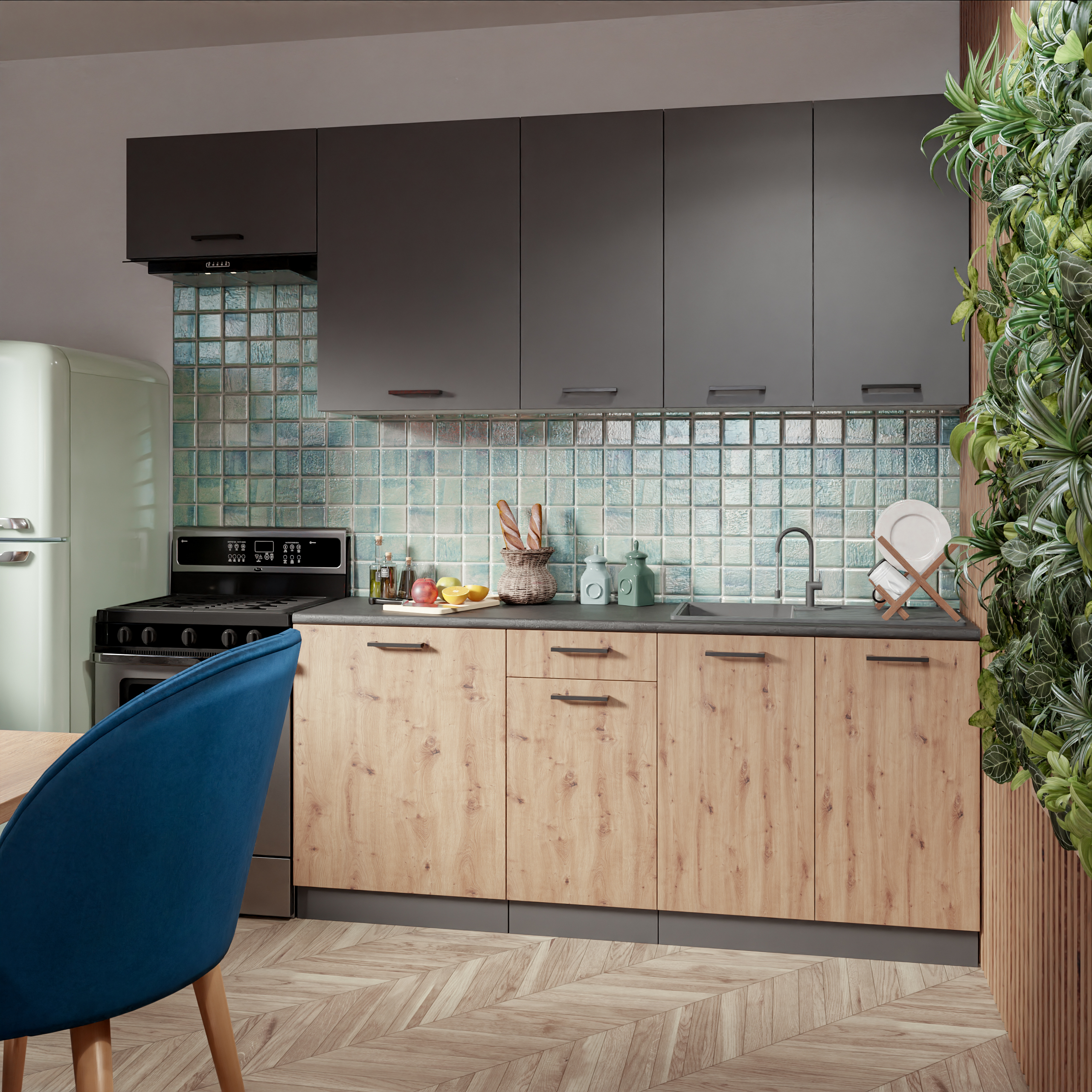 A belső terek mindennapi életünk fontos részét képezik, és a tér elrendezése nagy hatással van közérzetünkre. Az egyik különösen érdekes tervezési kihívás a harmonikus belső tér kialakítása, amely ötvözi a különböző stílusokat. Egy ilyen egyedi elrendezésre példa a nappalihoz kapcsolódó kis konyha, amelyben az eklektikus karakter dominál - a modernitás és a retro árnyalat keveréke.