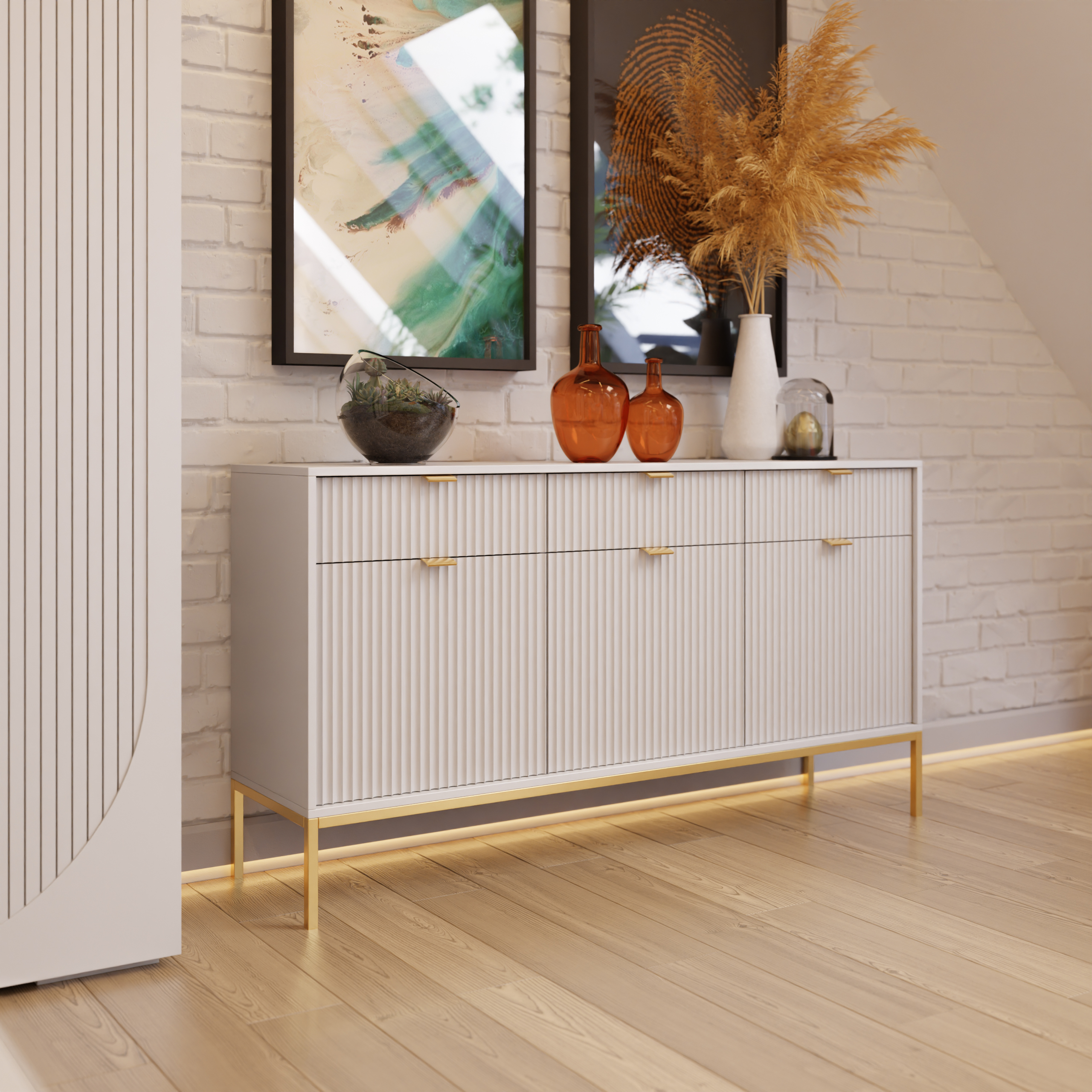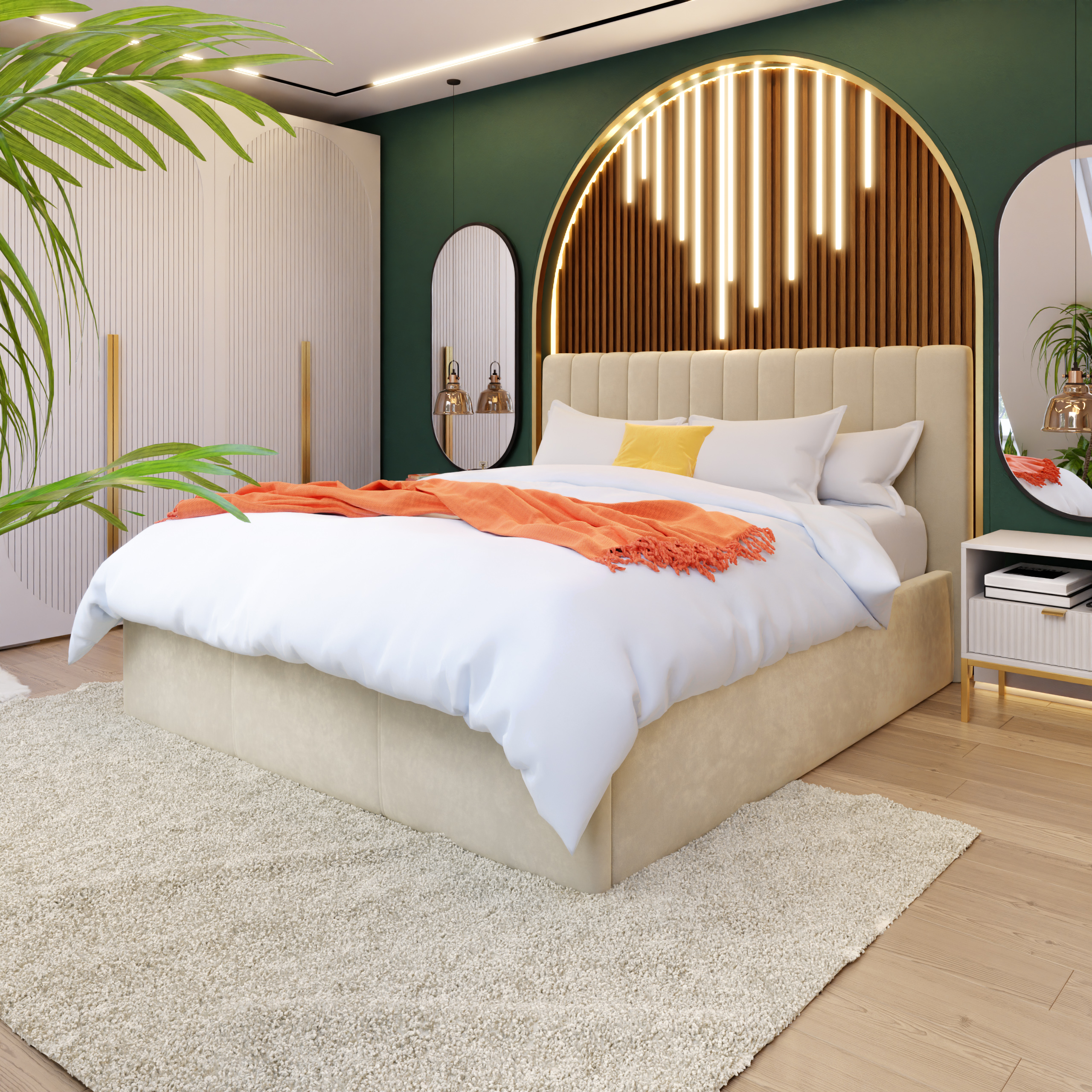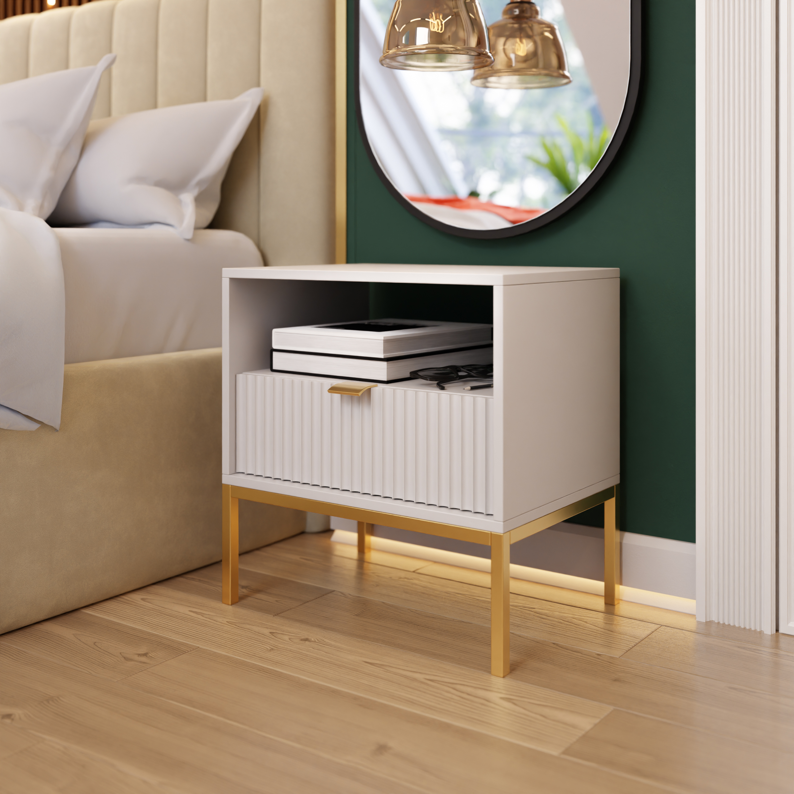 Az éjjeliszekrény is egyedi dekorációs elem. A mart előlapok és arany részletek frissességet és finomságot kölcsönöznek a belső térnek.