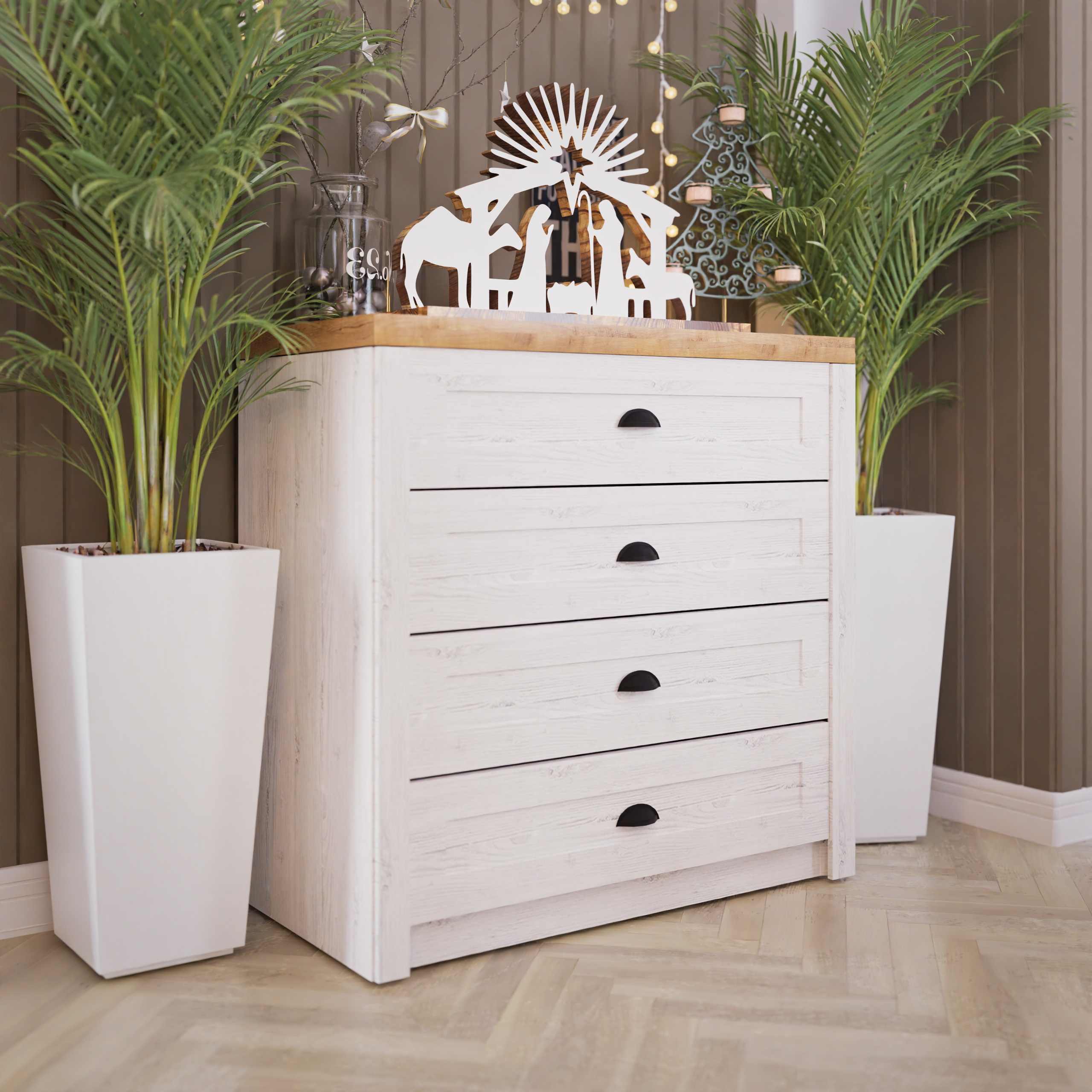 A Prowansja K4 komód is tökéletes kiegészítője az étkezőnek. Ideális alap a terítőknek, karácsonyi motívumokkal díszített futóknak és egyéb dekorációknak. A dokumentumokat praktikus fiókokban is tárolhatja. Ennek a változatnak a teteje tökéletesen szolgál majd a karácsonyi dekoráció alapjául. Időtlen kialakítását érdekes fogantyúk egészítik ki, amelyek megkönnyítik a nyitást.