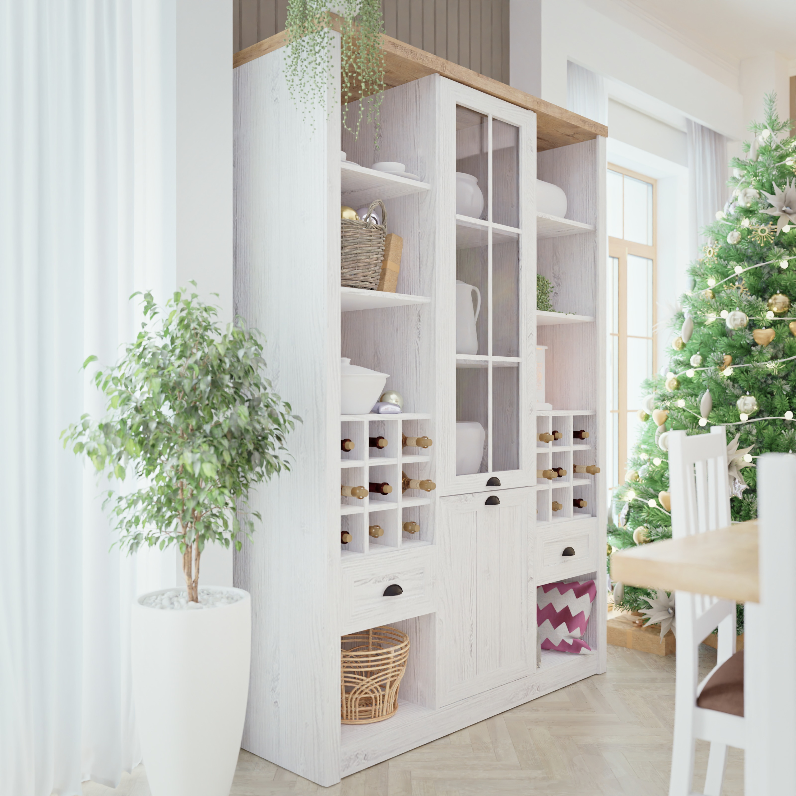 A porcelán, a karácsonyi díszek vagy egy borkollekció mind-mind helyet kap a Prowansja kredencének polcain. Ezen kívül a bútor praktikus fiókokkal rendelkezik, amelyekben elhelyezhet egy tartalék evőeszközkészletet, szalvétát vagy egyéb apró kiegészítőket. A modellnek van egy betanított alkatrésze is, ahová kényes tárgyakat helyezhet el, amelyeket védeni kell a véletlen törés ellen.
