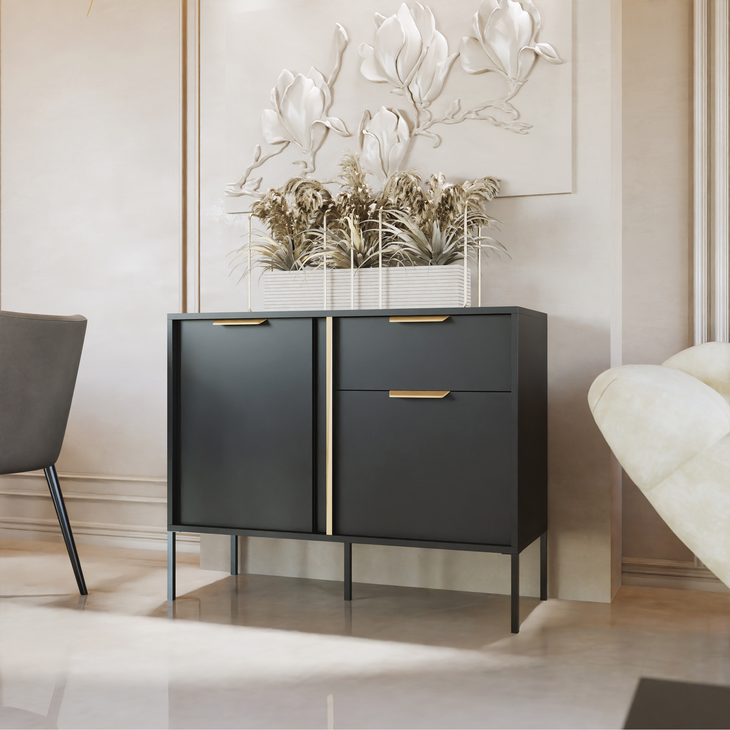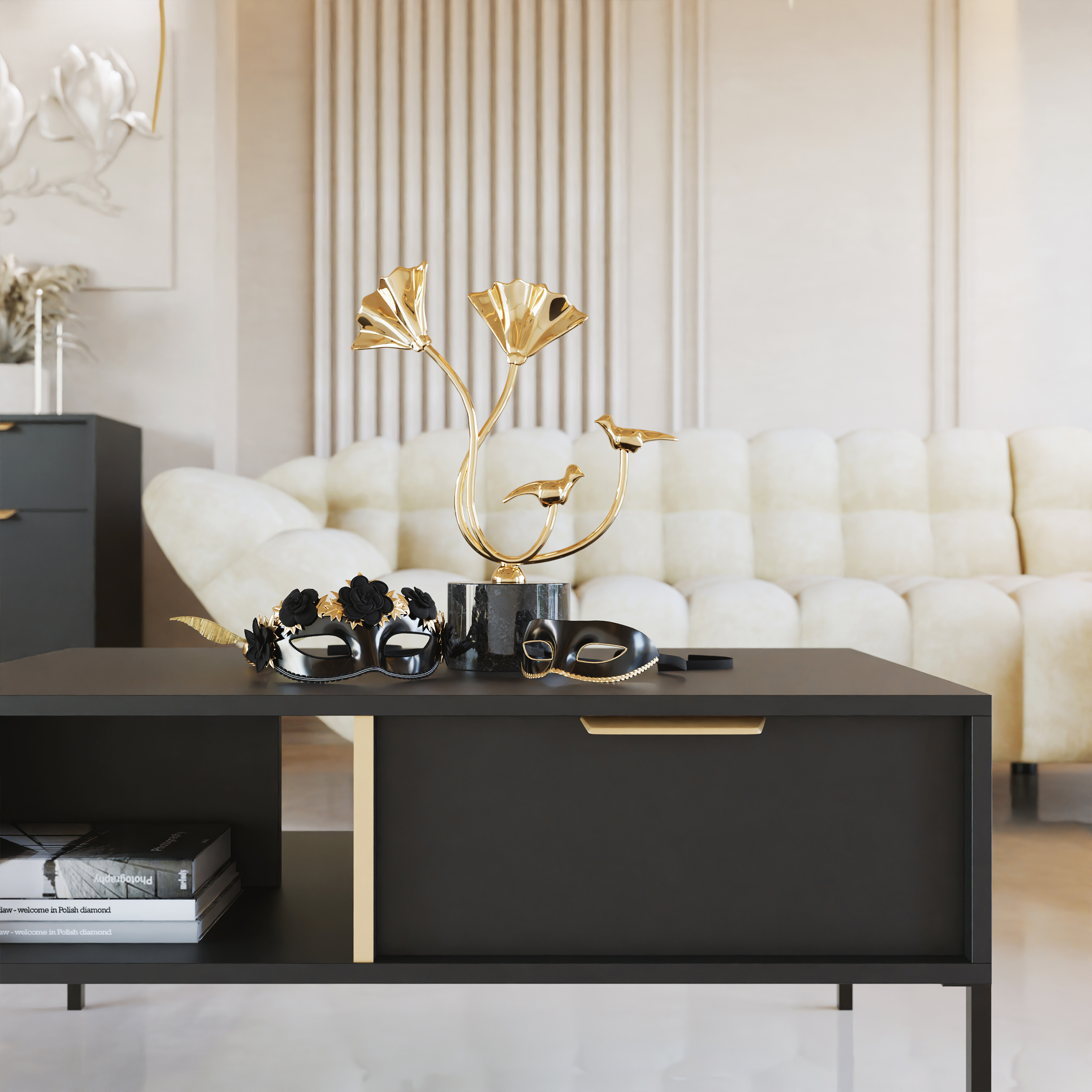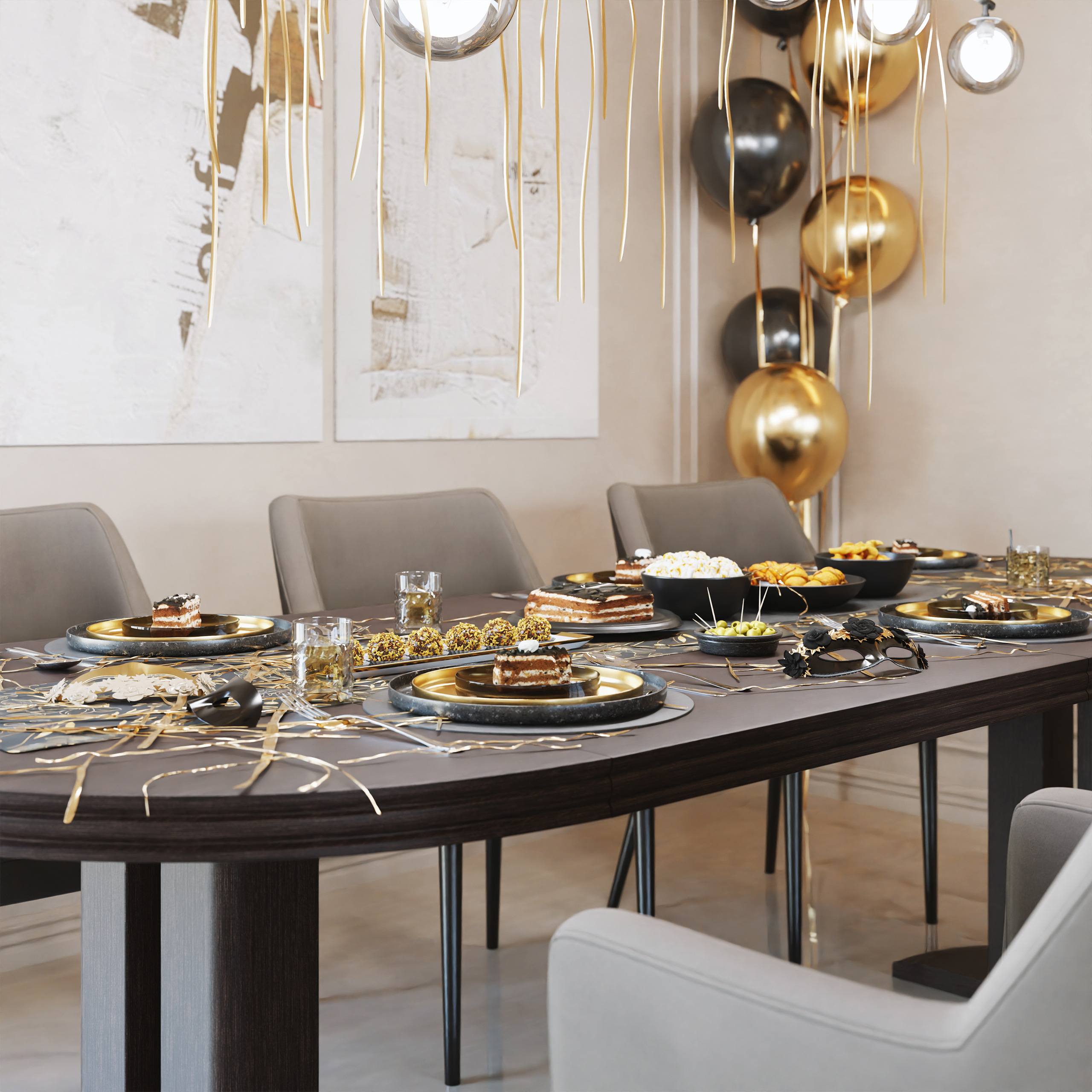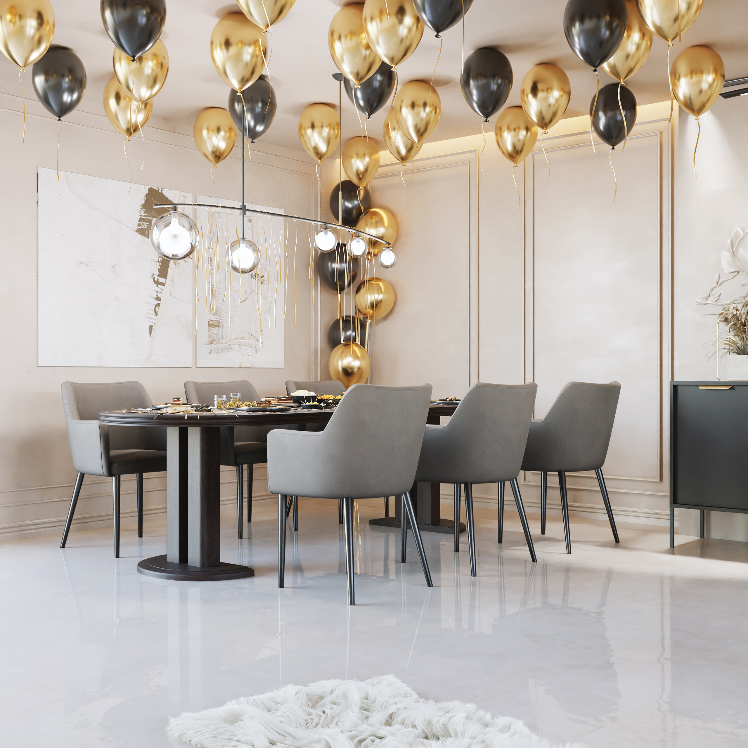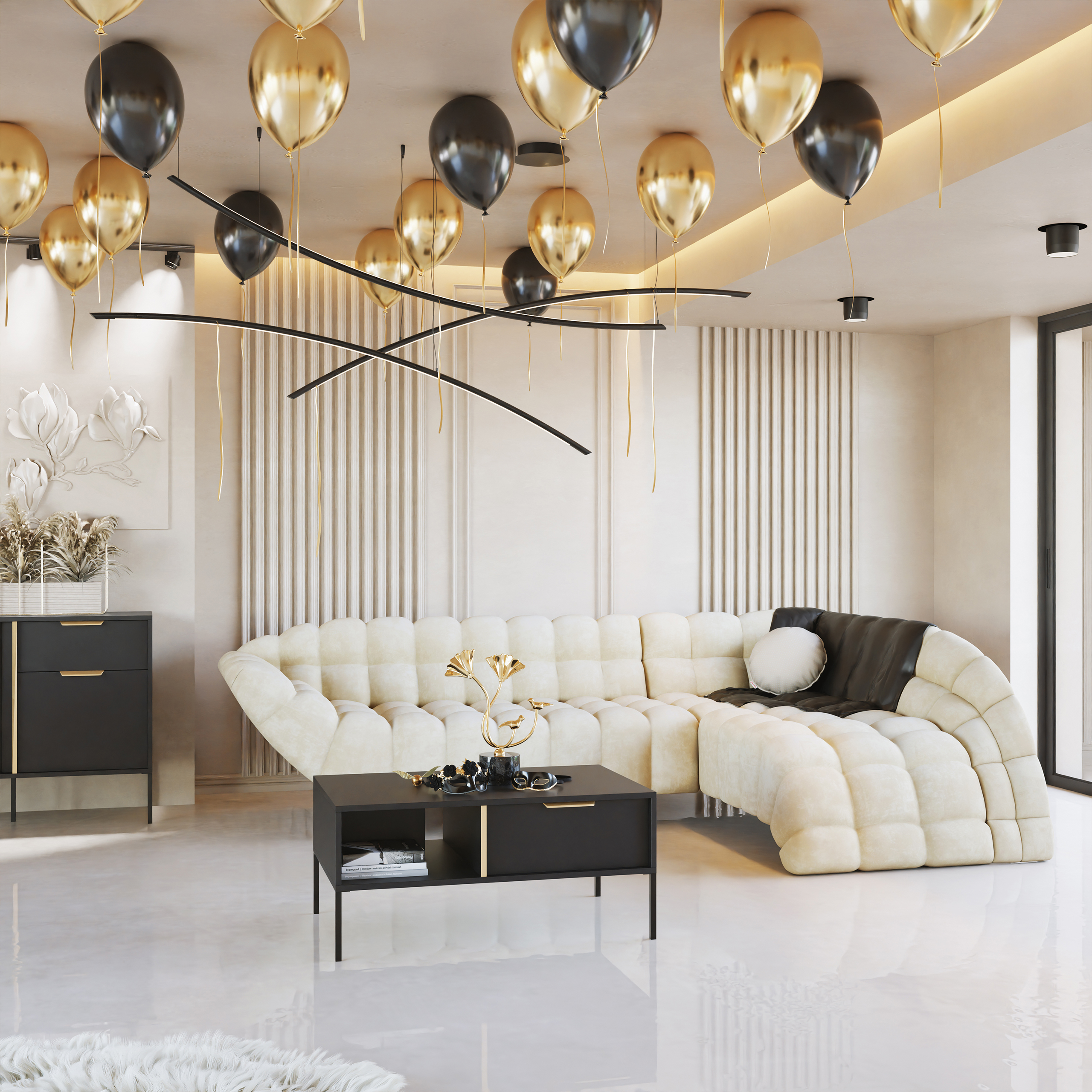 A világos falak semleges hátteret hoznak létre, amely merész formákkal és színekkel is kiemeli a bútorokat. Az arany akcentusok gyengéden hangsúlyozzák a belső tér karakterét, és extravagáns hangot adnak neki. A fekete kiegészítők olyan kontrasztot biztosítanak, amely mélységet és egy kis titokzatosságot visz a térbe. Az elrendezés fontos eleme az arany és fekete karneváli dekoráció. A szoba sarkában csillogó léggömbök és a díszekkel borított asztal olyan részletek, amelyek a nappalit az ünneplés helyszínévé varázsolják. Az egész összefüggő és rendkívül elegáns környezetet teremt.