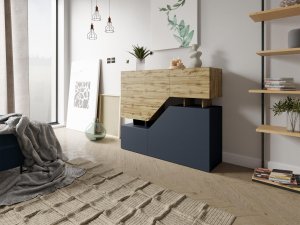 A modern Ceelias komód dizájnos megjelenésével lenyűgöz. Az aszimmetrikus előlapok érdekes mintát hoznak létre, amely minden nappali belső terének fő dekorációja lesz. A divatos hatást a gondosan kiválasztott színkombináció fokozza. Felfrissíti a nappalit, és néhány futurisztikus akcentust ad hozzá.