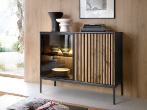 Az üvegezett Setno K104 komód eredeti megjelenést kölcsönöz a nappalinak. A bútorok gazdag színvilágát az előlap hatásos dekorációja hangsúlyozta. A hosszanti csíkok kiemelik a komód eleganciáját, és ezzel együtt az egész szoba jó stílusát. Az ajtó mögött elrejtett hely diszkrét tárolóhely a különféle kiegészítők számára. Az enteriőr karakterét kölcsönző kiegészítők megtalálják a helyüket a bútor üvegrészében.