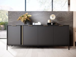 A komód alapja finom lábakra van helyezve, amelyek könnyedebbé teszik a bútorokat és segítik a napi takarítást. Könnyen elérhet minden sarkot, aminek köszönhetően élvezheti a stílusos és tiszta belső teret. A sötét színek tökéletesen kontrasztoznak az arany elemekkel.
