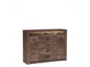 Az Indianapolis N07 komód jó megoldás a nappaliba. 4 fiókkal és 2 szekrénnyel van felszerelve. Az előlapok és a karosszéria fa színű laminált lapból készült. A pult alatti rúd natúr, csiszolt fa, mely további LED szalaggal történő megvilágítás után gyönyörű hatást kelt.