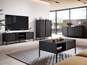 A készlet tartalma: TV szekrény és dohányzóasztal. Tárolásra két komód szolgál majd. Az egész elegendő helyet biztosít kedvenc dekorációinak tárolására és megjelenítésére. A praktikus fiókokban mindent elhelyezhet, amit érdemes gyorsan kéznél tartani. Az alkalmanként használt dolgokat felteheti a polcokra. A nyitott terek ideális hely a multimédiás berendezések és az érdekes dekorációk számára. A nappali bútorai fém lábakra vannak rögzítve, ami könnyebbé és könnyebben rendben tarthatóvá teszi.