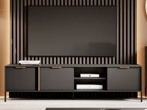 A sötét színek arany elemekkel kombinálva tökéletesen illeszkednek a modern és klasszikus belső terekhez. Kontrasztok kombinációja, amely mindenkit lenyűgöz! A tágas rekeszeknek köszönhetően könnyedén tárolhatja kedvenc filmjeit, könyveit vagy konzoljátékait. A modern TV-szekrény polcokkal is fel van szerelve a multimédiás berendezések számára.
